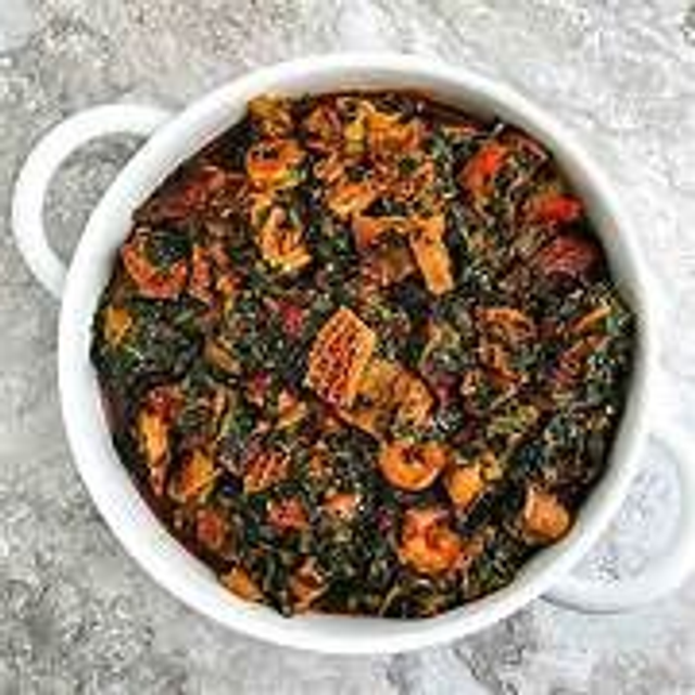 This soup is made with palm oil, spinach leaf, stockfish, smoked fish, and peppers. See Allergen Chart for more information.